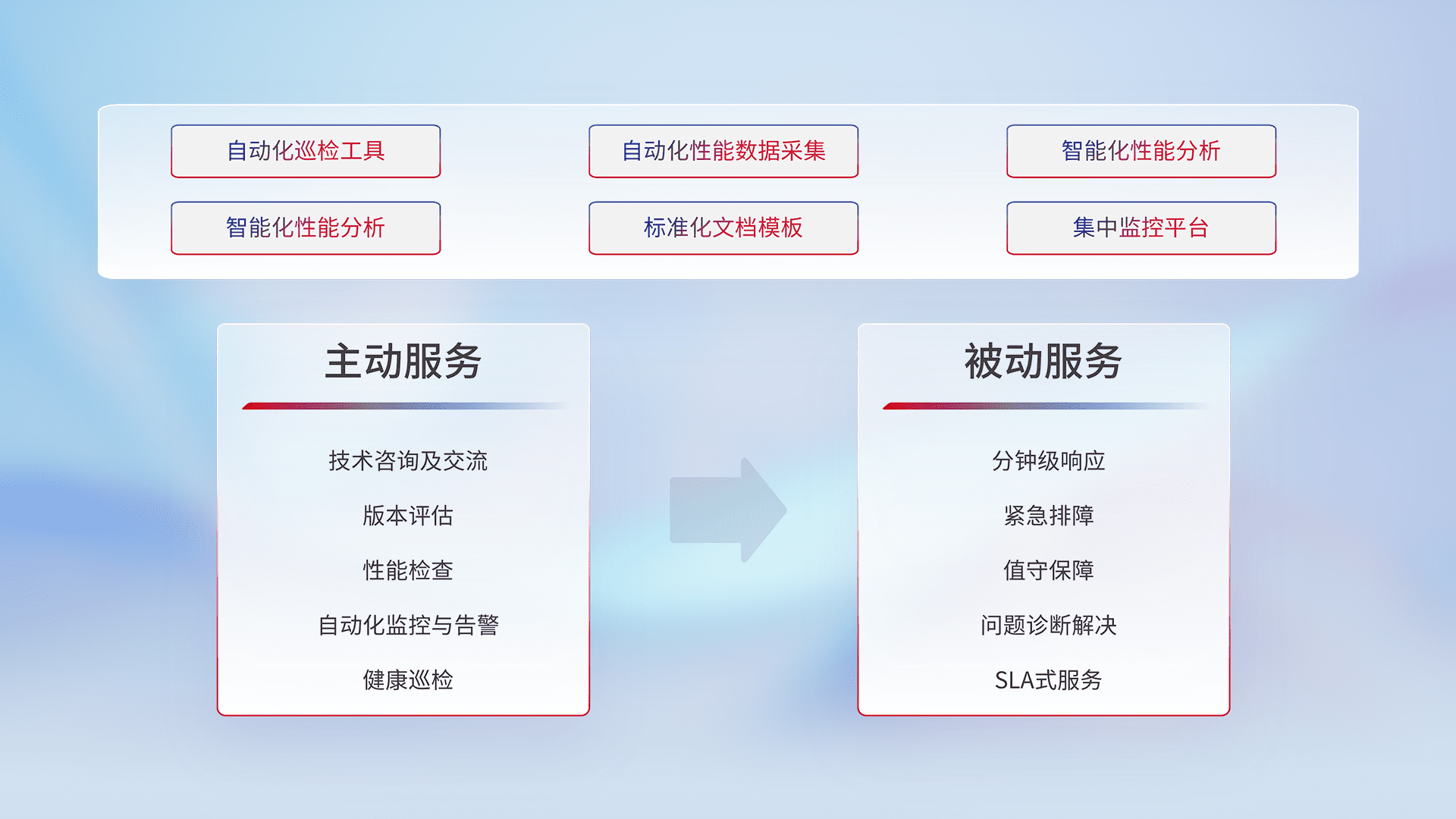 智能化工具和标准化文档,,保障服务质量,,,,提供主动服务(包含技术咨询、、版本评估、、、、性能检查、、自动化监控与告警、、、健康巡检)和被动服务包含(分钟级响应、、紧急排障、、、、值守保障、、、、问题诊断解决、、、、SLA服务)。。。。