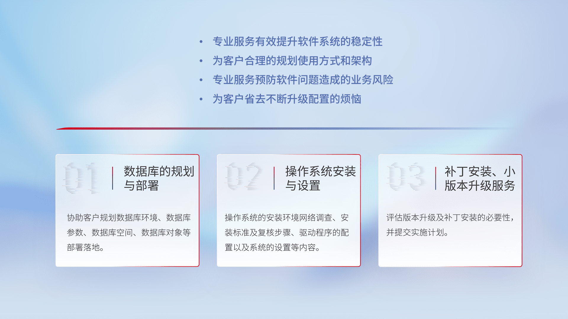 为客户提供软件规模升级、、、、快速部署、、、、按需配置的专业服务,,,,从数据库的规划与部署到操作系统的安装与设置,,,,再到补丁安装和小版本升级提供支持。。。。